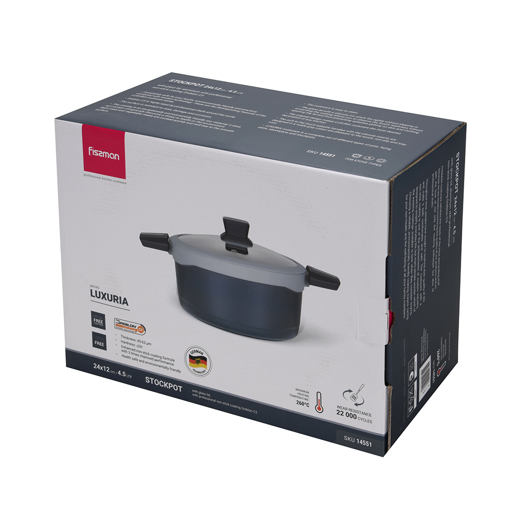 Absoliuti sauga sveikatai, ekologiškumas ir komfortas kartu su pažangiomis technologijomis yra pagrindinės LUXURIA serijos savybės. LUXURIA serijos privalumai: - Atsparus nusidėvėjimui, pažeidimams ir korozijai. – Ekologiškos medžiagos be sveikatai ir aplinkai kenksmingų komponentų. - Lygus paviršius užtikrina greitą ir kokybišką gaminimą. - Stiklinis dangtelis su silikono apvadu tvirtai priglunda, todėl galite stebėti gaminimo procesą neatidarant indo ir apsaugoti nuo purslų. - Puode patogu virti kiaušinius, gaminti košes, kukulius, makaronus, virti vandenį ir pieną. - Dėl unikalaus dizaino LUXURIA gaminiai yra tikra virtuvės puošmena. – Bakelitinės rankenos su minkšta danga ir silikoniniais įdėklais yra malonios liesti, neslidžios ir išlieka vėsios gaminant. - Suderinamas su visų tipų kaitlentėmis, įskaitant stiklo keramiką ir indukcines. FISSMAN indų serija LUXURIA yra pasirinkimas tiems, kurie vertina kokybę. Kiekvienas kūrinys yra meno kūrinys, jungiantis patikimumą, universalumą ir ilgaamžiškumą. Įsigydami šį indą investuojate į savo sveikatą ir gerinate savo gyvenimo kokybę.