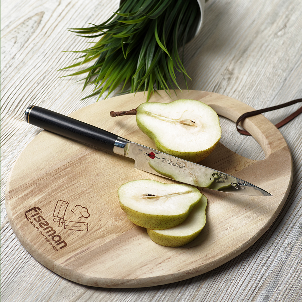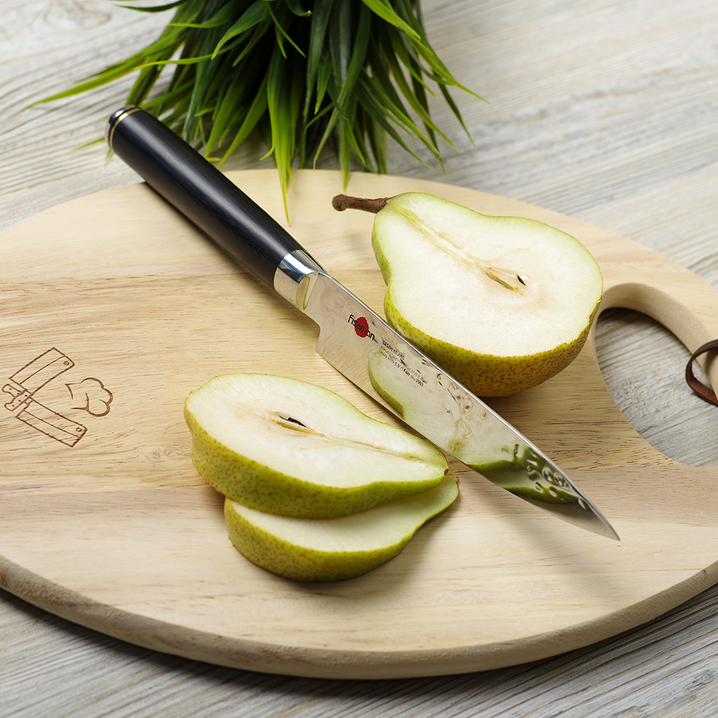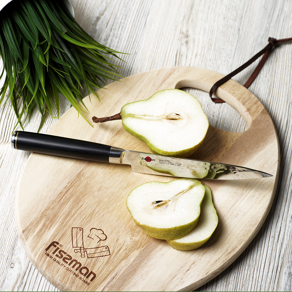 Kulinarijos pasaulyje dažnai sakoma, kad virtuvėje svarbiausias įrankis – geras peilis. Tinkamas peilis gali būti didžiulė pagalba, ruošiant gražius patiekalus ir užtikrinant optimalų saugumą virtuvėje. Jei naudojate tinkamai pagamintą ir pagaląstą peilį, galėsite geriau kontroliuoti, ką ir kaip pjaunate. Pjovimas patogiu ir aštriu peiliu yra daug malonesnis. Jis yra efektyvesnis ir gali greitai ir chirurgiškai atlikti darbą, nesvarbu, ar pjaustote žalumynus, ar didžiulį moliūgą, net muskato riešutus. Štai kodėl FISSMAN pristato visiškai naujo lygio peilius ir kirvius, sukurtus Seki mieste, Gifu prefektūroje. Ten, kur daugiau nei prieš 800 metų pirmieji kalviai įkūrė dirbtuves, skirtas kalti aštriausius visoje Japonijoje žinomus kardus, o po kelių šimtmečių šie gaminiai buvo naudojami garsių vietinių peilių gamyboje. Mūsų peiliai yra įkvėpti Japonijos, jie dvelkia bekompromisės kalvystės dvasia ir aistra. Universalus peilis FISSMAN KENSEI KOJIRO 5,5" yra mažesnis nei virėjo, bet šiek tiek didesnis už daržovių peilį, todėl jis yra puikus įrankis, daugeliui virtuvės užduotims. Universalus peilis FISSMAN KENSEI KOJIRO 5,5" idealiai tinka pjaustyti įvairias kvapnias žoleles, česnaką, imbierą, taip pat pjaustyti daržoves ar smulkius mėsos gabalėlius . Atsparus korozijai ir patvarus dėl specialios Korudo metalo šalto grūdinimo technologijos iki 58 HRC pagal Rokvelo skalę.Ašmenys pagaminti iš AUS-8 daug anglies turinčio japoniško plieno, šis plienas yra labai tvirtas. Peilis šlifuotas rankomis 6000 grūdėtumo, vandens pagrindo šlifavimo akmens, nepriekaištingam aštrumui išgauti. Dėl galandinimo 15-17 laipsnių iš kiekvienos pusės yra puikus pjovimo kampas. Peilio rankena pagaminta iš aukštos kokybės medžiagos G-10, kuri puikiai atlaiko tiek žemą, ir aukšta temperatūra ir dėl kurių peilis neslysta rankoje ir nesugeria pašalinių kvapų.
