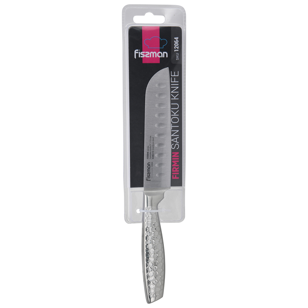 Santoku yra tradicinis japonų stiliaus peilis. Pats žodis japonų kalba reiškia „trys dorybės“, nurodant užduotis, kurias šis peilis gali atlikti: pjaustyti, pjaustyti ir kapoti. Išvaizda jis panašus į Didįjį šefo peilį, tačiau turi savitą formą su lenktu galu ir tiesia ašmenimis, dažnai vadinama „avies koja“. Ši forma leidžia atlikti tikslesnį pjaustymo judesį aukštyn ir žemyn, kuris gali būti efektyvesnis ir tikslesnis nei judesys pirmyn ir atgal naudojant virėjo peilį. Santoku peilių ašmenyse paprastai yra įpjova, vadinama Grantonu. Šie grioveliai padeda sumažinti trintį ir neleidžia maistui prilipti prie ašmenų pjaustant. Visi FIRMIN serijos peiliai yra pagaminti iš aukštos kokybės X30Cr13 nerūdijančio plieno, pasižyminčio puikiomis eksploatacinėmis savybėmis. Peilių, pagamintų iš X30Cr13 plieno, pranašumai yra stiprumas, kietumas ir atsparumas dilimui. Klasikinis europietiškas galandimas, simetriškas per visą pjovimo briaunos ilgį, užtikrins neįtikėtiną naudojimo patogumą. Elegantiška nerūdijančio plieno rankena yra ergonomiškos formos, kad būtų patogu laikyti. Pagaminti pagal profesionalius standartus, šie peiliai yra patvarūs ir gerai subalansuoti, kad tarnautų labai ilgai. FISSMAN padės įgyvendinti jūsų drąsiausias idėjas virtuvėje! Lengvi pusryčiai, sotūs pietūs, skani vakarienė – FISSMAN padės įgyvendinti bet kokias idėjas!
