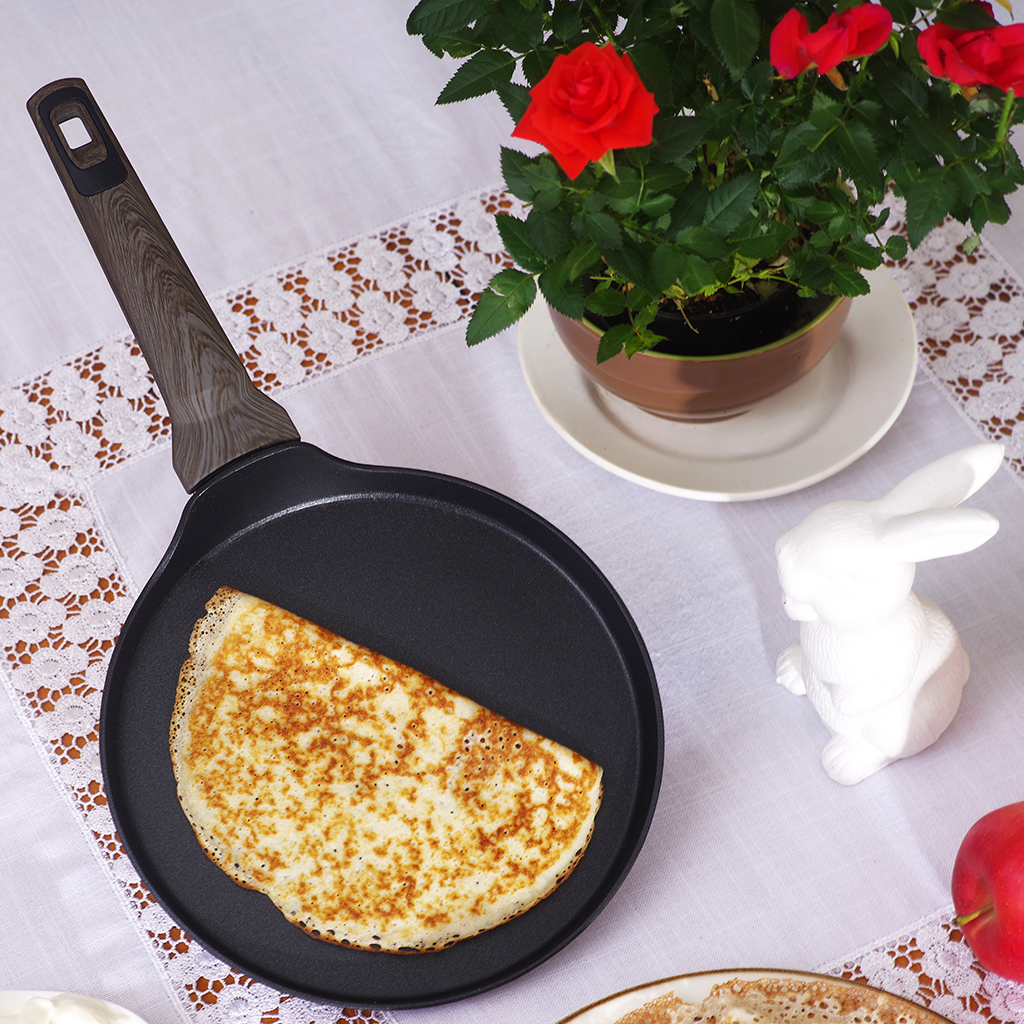 • Zemā pannas maliņa ļauj ērti apgriezt un noņemt pankūkas.