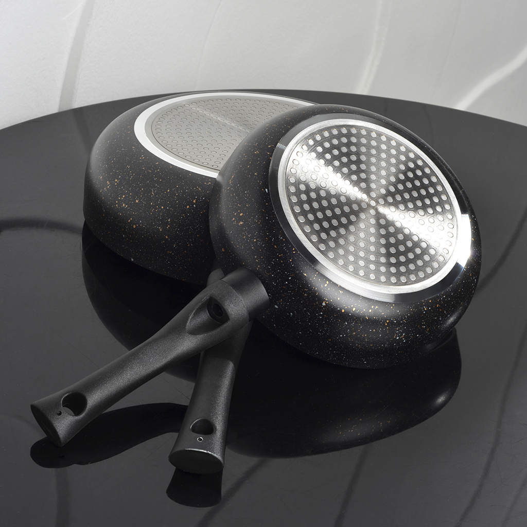 Dziļā panna PROMO 28x7 cm ar bakelīta rokturi izgatavota no augstas kvalitātes izturīga alumīnija ar pretpiedeguma parklājumu Touch Stone. Alumīnijs ātri uzkarst un ilgi uztur siltumu. Daudzslāņu rievots pārklājums Touch Stone izgatavots no ekoloģiski tīra materiāla un sastāv no vairākām akmens daļiņām. Pārklājums ar zelta un sudraba plankumiem ir antibakteriāls un izturīgs pret koroziju un nodilumu. Panna piemērota visu veidu plīts virsmām, droša veselībai un videi. Nav ieteicams mazgāt trauku mazgājamajā mašīnā.