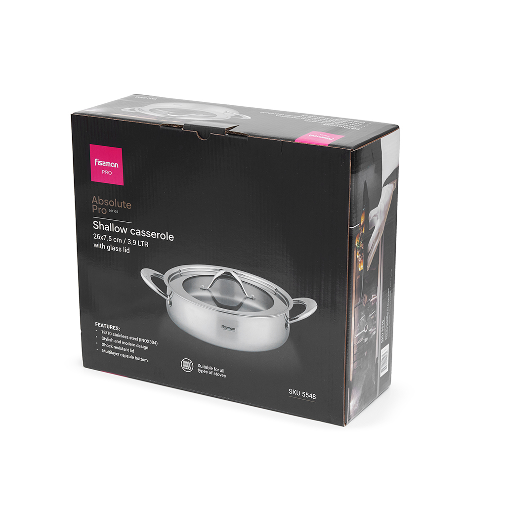 ABSOLUTE PRO tērauda trauku sērija no FISSMAN – stila, kvalitātes un inovāciju apvienojums vienā produktā. Pateicoties eleganta dizainam, trauki kļūs par īstu virtuves rotājumu. ABSOLUTE PRO izgatavota no augstas kvalitātes nerūsējošā tērauda 18/10 (INOX 304), kas nodrošina ilgmūžību un izturību pret koroziju. Daudzkārtu pamatne garantē vienmērīgu siltuma sadalījumu un ātru ēdiena gatavošanu. Jūsu ēdieni tiks pagatavoti ātrāk, saglabājot visas uzturvērtības un garšas īpašības. ABSOLUTE PRO trauku priekšrocības: - • Korpuss no augstas kvalitātes 18/10 tērauda (INOX304); - • Stilīgs un mūsdienīgs dizains; - • Triecienizturīgs vāks; - • Mērskala; - • Uzticamība un ilgmūžība; - • Ātra uzsildīšana un vienmērīgs siltuma sadalījums; - • Saglabā produktu uzturvērtības; - • Ērta lietošana un kopšana; - • Piemērots visiem plīts veidiem. ABSOLUTE PRO no FISSMAN kļūs par uzticamu palīgu, gatavojot garšīgus un veselīgus ēdienus, kā arī izcels jūsu individuālo stilu un gaumi.