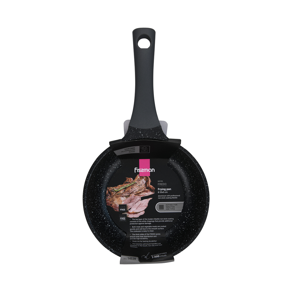 Серия FREDO с покрытием Marble собственной разработки FISSMAN покорит Вас с первого взгляда. Литая алюминиевая основа, качественное антипригарное покрытие, классический дизайн, благородный черный цвет с белыми вкраплениями делают коллекцию FREDO любимой и желанной на каждой кухне.