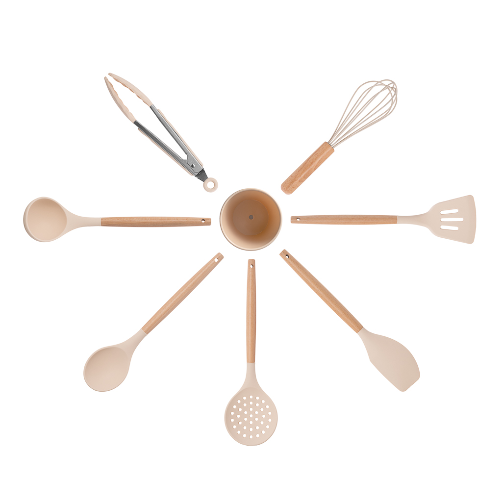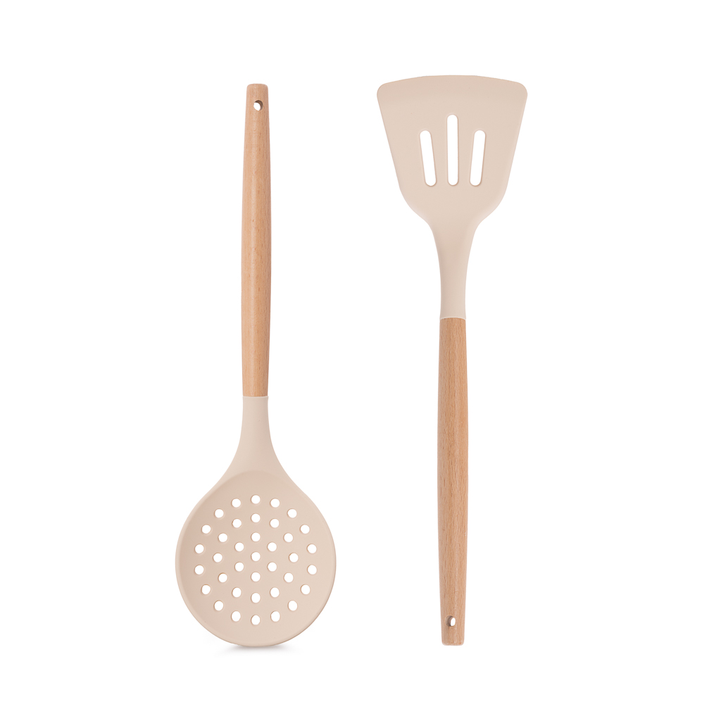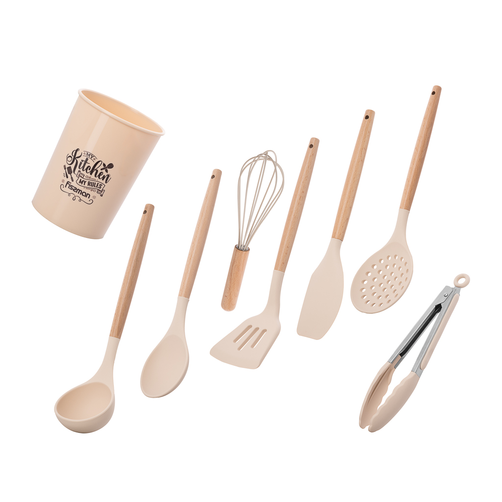 Набор кухонных инструментов FISSMAN FELAN 8 пр. — это идеальное сочетание практичности, комфорта и элегантного дизайна. Этот набор станет незаменимым помощником на вашей кухне, помогая легко справляться с любыми кулинарными задачами. Каждый предмет набора изготовлен из высококачественного пищевого силикона, который не содержит бисфенола и безопасен для здоровья. Силиконовые элементы устойчивы к высоким температурам и не царапают поверхность посуды, что делает их универсальными для использования с любыми материалами, включая тефлон и стекло. Ручки инструментов выполнены из натурального бука — экологичного материала, который славится своей прочностью и приятной текстурой. Эргономичный дизайн ручек обеспечивает комфортный хват, а их природная красота добавляет изделиям особый шарм.